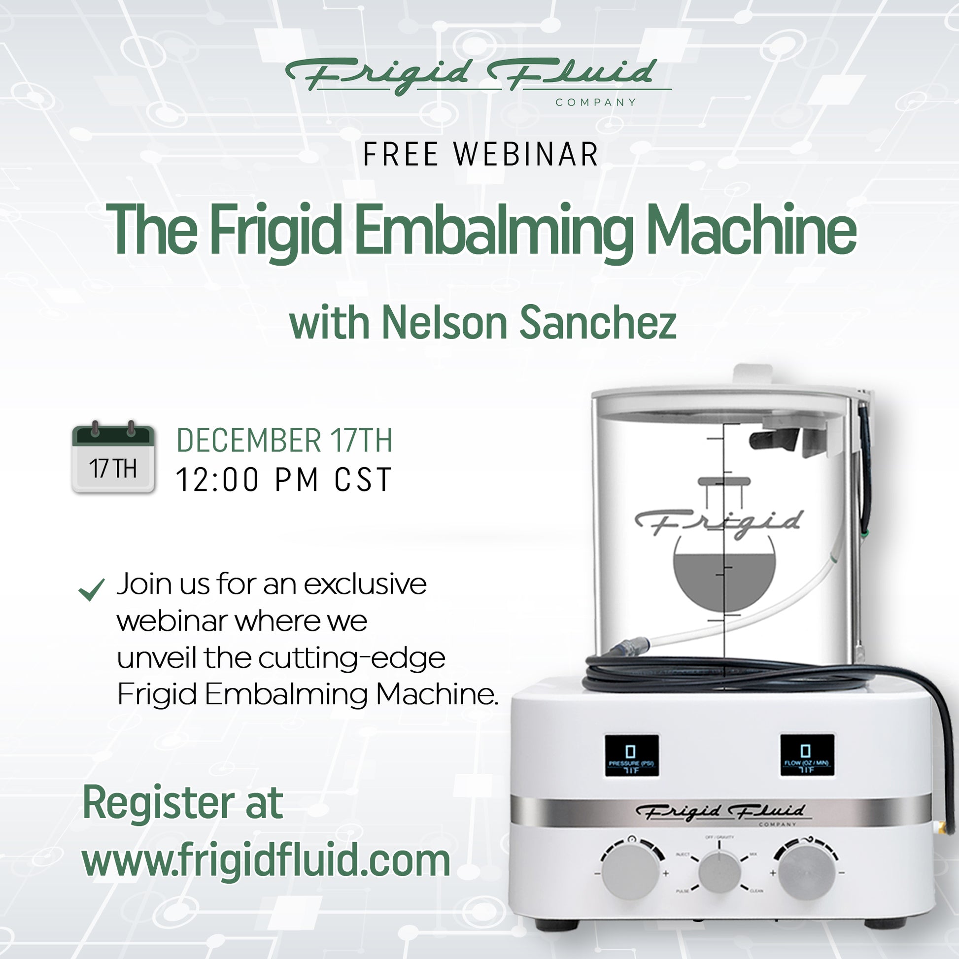 Discover the future of embalming technology in this exclusive live webinar hosted by Frigid Fluid Company. Join Nelson Sanchez on December 17th at 12:00 PM CST as we unveil the cutting-edge Frigid Embalming Machine and demonstrate its advanced features designed to deliver precision, consistency, and efficiency for funeral professionals.